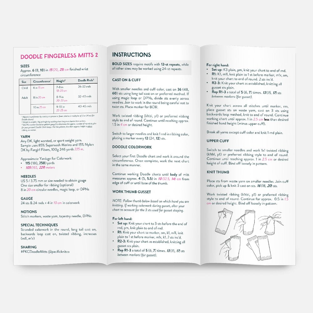 The BASE DOODLE FINGERLESS MITTS 2 will keep your hands cozy while sporting your favorite colorwork motifs! The simple shape and easy construction makes these a fast, satisfying project! You can get as creative as you want with patterns, textures, or just knit it plain. The options are endless!